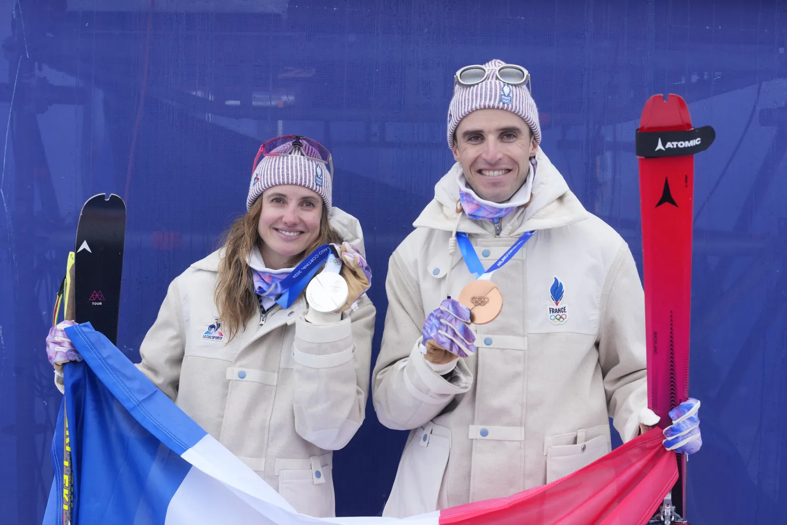 Emily Harrop et Thibault Anselmet, médaillés en ski-alpinisme aux Jeux Olympiques de Milan-Cortina.