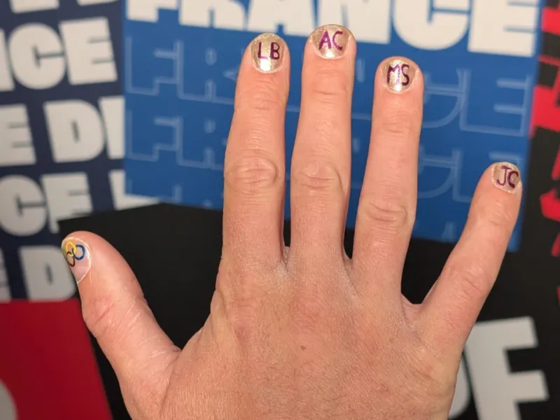 “LB”, “AC”, “MS”, “JC” peut-on lire sur ses doigts, hormis les pouces. « Cela correspond aux initiales de tous les athlètes de l’équipe », plaisante le principal concerné. Cela tombe bien, ils sont huit. Loan Bozzolo, Aidan Chollet, Merlin Surget et Jonas Chollet sont sur la main droite. Chloé Trespeuch, Léa Casta, Julia Nirani-Pereira et Maja-Li Iafrate-Danielsson ont hérité de la main gauche. Sur ses pouces sont dessinés les anneaux olympiques et une médaille d’or. « On a fait ça cet après-midi. Léa a plus la patte artistique que moi je crois. Une main est plus réussie que l’autre, mais si ça peut nous porter chance, c’est cool », se marre Julia. Loin de nous l’idée de juger, mais s'approchant de plus près, c’est vrai que l’une des deux en jette davantage.