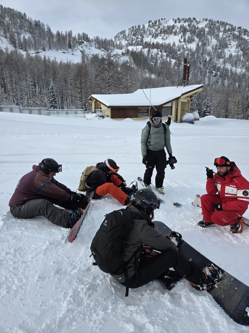 On préfère vous prévenir, dans les lignes qui vont suivre, il y a assez peu d’effort et beaucoup de réconfort. Le principal effort pour nos gagnants était celui de mettre les chaînes sur les pneus pour arriver jusqu’à la station, puisque la neige, elle, était déchaînée. Une fois sur place, avec un temps plus clément, nos supporters était attendu par leur professeur du jour, Florian Lombardo, du club Back to Back d’Isola2000, qui coche toutes les cases du bingo d’un bon mono de snow: local de l’étape, ancien pro, très cool, pas fâché avec la déconne.