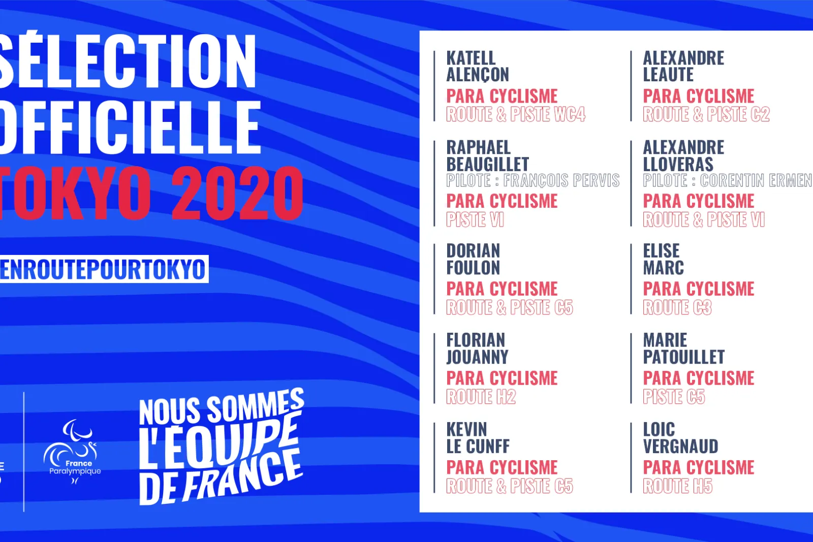 En para cyclisme, ils sont donc 10 appelés en Equipe de France avec Katell Alençon, Raphaël Beaugillet, Dorian Foulon, Florian Jouanny, Kevin Le Cunff, Alexandre Leaute, Alexandre Lloveras, Elise Marc, Marie Patouillet et Loic Vergnaud.